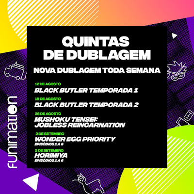 A Funimation irá lançar uma nova dublagem de anime em português por semana a partir dessa semana, os lançamentos serão sempre às quintas na plataforma de streaming e os primeiros animes para as "Quintas de Dublagem" também já foram revelados, veja lista e datas logo abaixo: